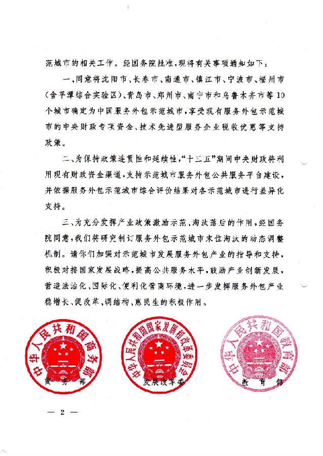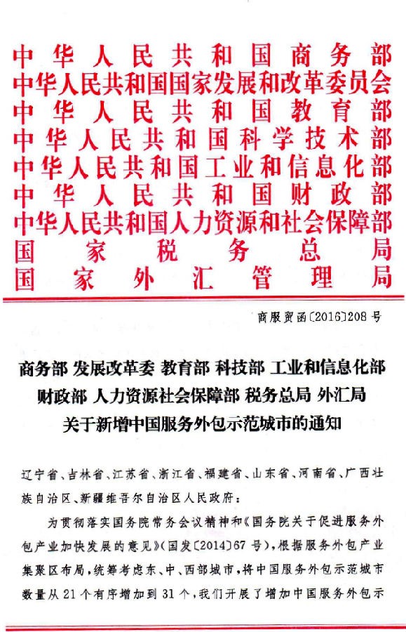 商服贸司[2016]208号 商务部 发展改革委 教育部 科技部 工业和信息化部 财政部 人力资源社会保障部 税务总局 外汇局关于新增中国服务外包示范城市的通知