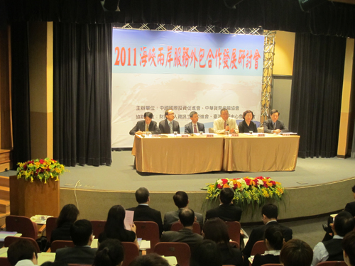 10月13日,由我会与台方中华货币金融协会共同主办,财团法人资讯工业策进会、台湾客服中心发展协会协办的“2011海峡两岸服务外包合作发展研讨会”在台北集思台大会议中心成功举办。除我会团组人员外,台方中华软体协会、中华物流协会等有关商协会,以及花旗银行、天逸金融服务集团、台寿保产险股份有限公司、互动资通股份有限公司、纬创软体公司等企业高管人员应邀参会。中华货币金融协会理事长许振明与我方代表团团长梁兆山先后致辞;中华软体协会大陆委员会主任委员李员和我会秘书长张强分别就台湾和大陆的服务外包产业发展现状与趋势发表演讲;软通动力副总裁牟永安、台湾客服中心发展协会常务理事温春馨、博彦科技副总裁刘仕如、上海金桥(集团)有限公司总经理助理陈恩华、台湾资策会创研所经理许誉胜分别就海峡两岸服务外包在各个产业合作的机遇进行了介绍并讨论。