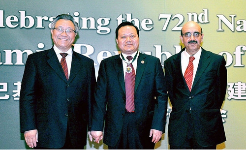 中国交通部长李盛霖、巴基斯坦驻华大使马苏德•汗与“国父真纳”奖获得者袁建民合影