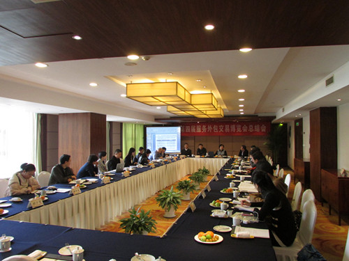 2012年11月20日上午,第四届中国国际服务外包交易博览会(以下简称服务外包博览会)工作总结会在杭州富阳国际贸易中心大酒店召开。商务部服贸司业务二处调研员姜义茂应邀出席了会议并致辞,浙江省商务厅、杭州市对外贸易经济合作局、美国高德纳公司、呼叫中心与服务外包研究院、北京瑞友科技有限公司、软通动力信息技术有限公司、浙大网新科技股份有限公司、华三通信技术有限公司、道富信息科技(浙江)有限公司、达内集团等地方商务主管部门、咨询机构、行业组织和服务外包企业的有关负责人共30余人参加了总结会。